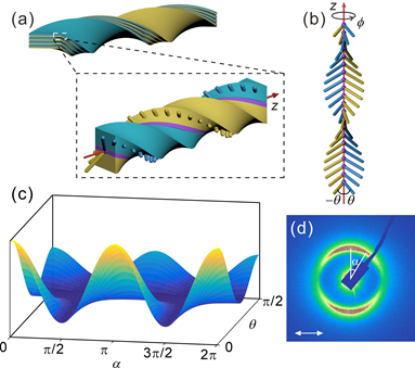 图2 (a-b) 螺旋纳米线结构的简化模型。(c) 基于散射理论的RSoXS信号强度分布模拟,与(d)实验结果完全一致。