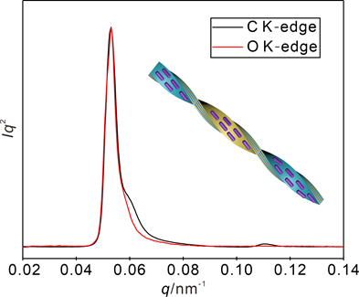 针对肩峰,如图4所示,在不同元素吸收边附近测试可以发现,该肩峰在氧元素吸收边附近信号强度降低,意味着不含氧元素的5CB对肩峰有贡献。这是首次利用实验的方式证明即使在各向同性状态下,5CB会受到螺旋纳米线结构的导向,沿结构的凹陷方向排布成为近螺旋的手性超结构。