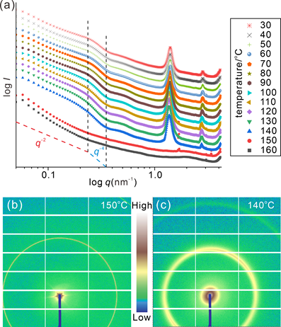 图5 (a) 5CB掺杂浓度为20%的混合体系的SAXS温度扫描,拐点为螺旋纳米线结构的平均厚度。(b-c)不同温度下的SAXS散射图样。