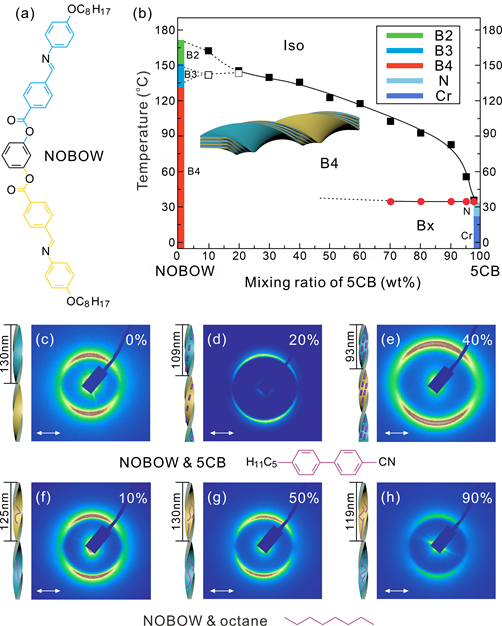图1 (a) 用于研究自组装行为的弯曲核心分子NOBOW。(b) NOBOW与棒状小分子5CB的二元相图。(c-h)掺杂5CB以及正辛烷的RSoXS二维散射图样以及螺距变化情况。
