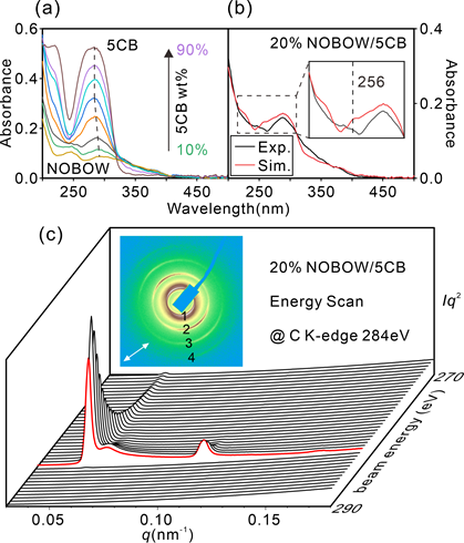 图3 (a-b) 不同5CB掺杂浓度下的红外吸收谱及其与模拟结果的差异。(c) 5CB掺杂浓度为20%混合体系的RSoXS信号能量敏感性,可以在碳元素K层吸收边附近观察到明显的肩峰以及高阶信号。