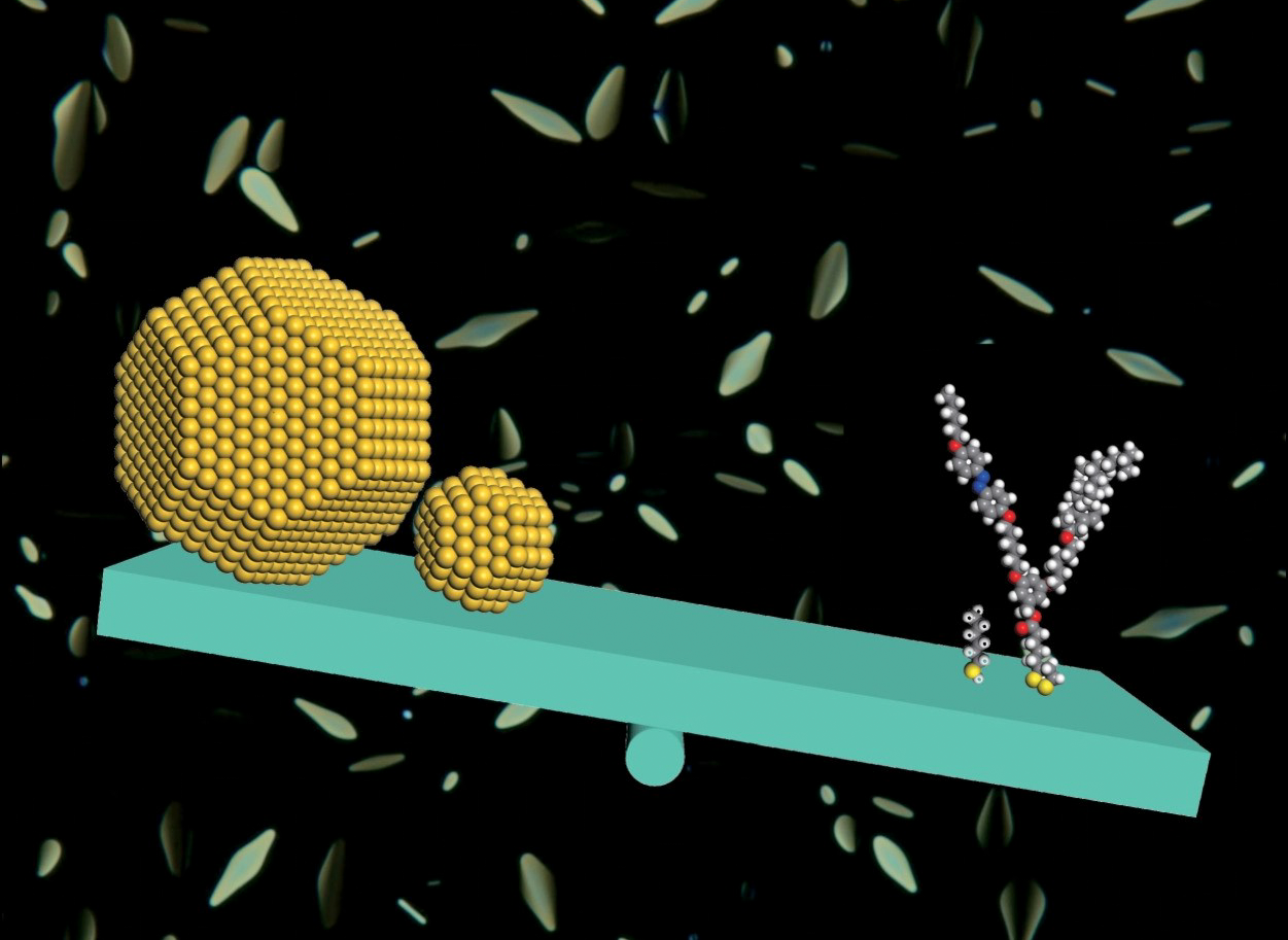 The correlation between the size of nanoparticles, the structure and shape of mesogenic ligands and the ensuing assembly behaviour is not really understood. Closer inspection shows very surprising features. Here, 2- and 4-nm gold nanoparticles (NPs) were synthesized, and grafted with a forked ligand containing two r...
